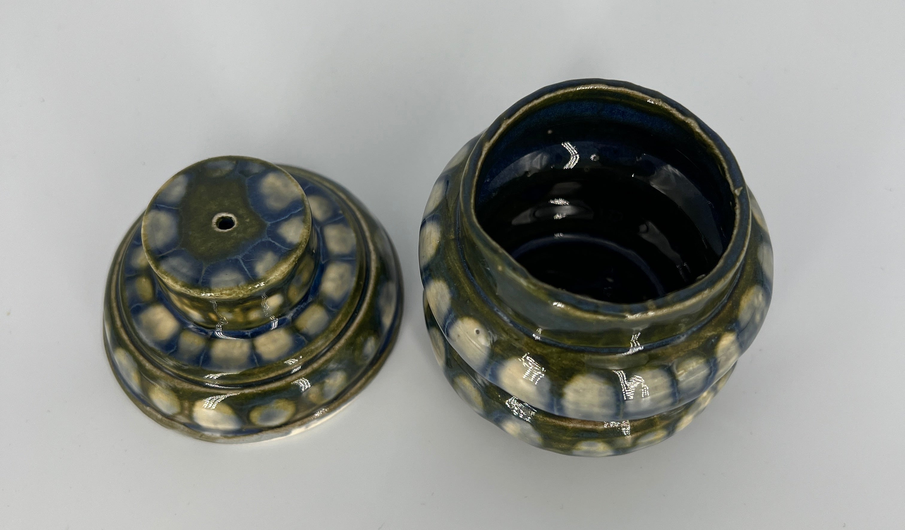 This striking little lidded vessel is perfect to burn cone incense.