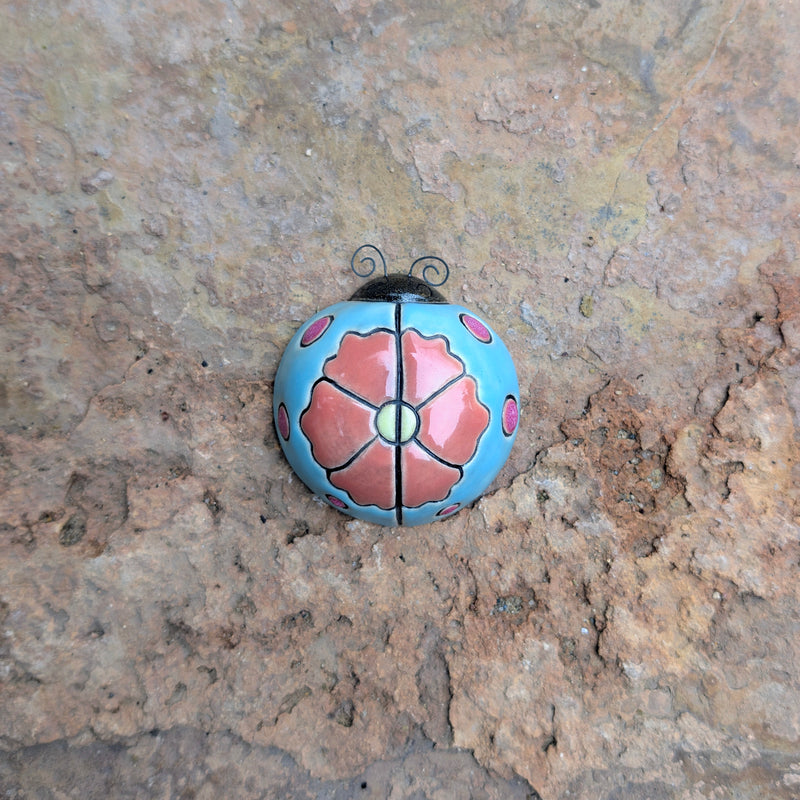 Each Ladybug in the Loveliness was wheel thrown with stoneware and altered. They can be admired while hanging on a wall or laying flat.
